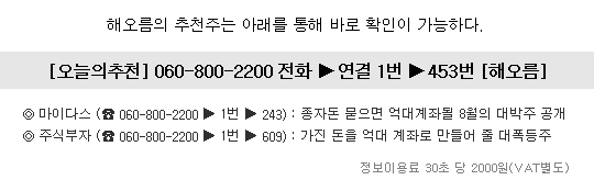 유료ARS 증권정보는 30초당 2000원(VAT별도)의 이용료가 부과됩니다.