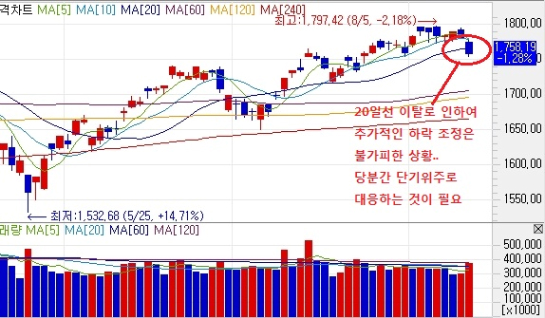 [김성세 실장의”The Prestige club”] * 업종별 전업종 하락 마감. 의료정밀 5%이상 급락, 증권, 전기전자, 운수창고, 섬유의복 등 2% 이상 하락. * 종목별 시가총액 상위 대부분 하락 마감. 현대차, LG화학, 기아차, 롯데쇼핑 등 상승 마감. 삼성전자, POSCO, 신한지주, 한국전력, KB금융, 하이닉스 등 하락 마감. 위의 차트에서 보는 바와 같이 지수는 20일을 지지 받지 못하고 이탈하면서 1760선을 이탈하는 모습을 보여주었다. 결국 지수는 전일 대비 22.94포인트(1.29%) 하락한 1758.19로 마감했다. 전일 미증시의 약세소식이 전해지면서 지수가 큰 폭의 조정을 받으면서 20일선 마저 붕괴하고 말았다. 특히 지수관련 IT대형주들의 약세로 지수 하락을 부추기는 모습이었다. 업종별로는 전업종에 걸쳐 하락 마감하였는데 특히 의료정밀 5%이상 급락하였고, 증권, 전기전자, 운수창고, 섬유의복 등 2% 이상 하락세로 마감했다. 종목별로 보면 시가총액 상위 대부분 하락 마감하였고 현대차, LG화학, 기아차, 롯데쇼핑 등 상승 마감했고 삼성전자, POSCO, 신한지주, 한국전력, KB금융, 하이닉스 등 하락 마감하였다. 원/달러 환율은 전날 대비 13.80원 상승한 1182.50원에 마감했다. [투자 전략] 그 동안 꾸준한 상승흐름을 이어갔던 지수는 미시장의 조정과 함께 연방공개시장위원회(FOMC)에서 양적 완화 정책에도 불구하고 여전히 경기 회복에 대한 우려감이 작용하면서 지수는 20일선 마저 이탈하고 말았다. 미국의 경기둔화 우려감이 부각되면서 증시에 불안 요소로 작용하였고 이에 따라 환율은급등 흐름을 나타내는 등 시장은 한국은행 금융통화위원회의 기준금리 결정과 옵션만기일을 옵앞둔 상황에서 다소 위축되는 분위기를 보여주었다. 또한 중국 주요 경제지표가 예상치 보다 저조한 흐름을 보여주었고 미국 2분기 노동생산성도 1분기에 비해 하락하는 등 미국과 중국 경제대북의 경기회복 둔화 우려가 증시의 약세를 부추겼다. 당분간 지수는 단기 바닥 찾기에 분주할 것이며 바닥흐름을 만들고 당분간 저점 박스권 흐름이 이어질 것으로 보여진다. 기술적 측면으로 보면 추세적으로 20일선이 상승추세는 이어지고 있지만 단기 이탈된 상황에서 빠르게 회복되지 못한다면 당분간 지루한 흐름은 염두에 두고 투자해야 할 것이다. 다만 추세의 흐름은 상승추세가 살아 았다는 점은 명심하기 바란다. 지수의 저점 예측치는 1720선으로 보고 있으며 하방향에 대한 흐름도 열어두고 대응하는 전략이 필요하다. 최근 장에선 특히 종목에 집중하고 대응하는 것이 바람직하며 쉽게 단기적인 고수익도 충분히 가능하다는 의견이다. 실제로 필자는 최근 성문전자 100%, 동부CNI 80%, 대우차판매 90% 등으로 승부하여 좋은 수익을 안겨드렸다. 이제 새로운 종목에 베팅을 시기임을 명심하라. 이제 새롭게 준비된 종목이 있으니 어려우면 필자의 조언을 따르기 바란다. 오늘도 성공투자 하시길.. [관심 종목] 성문전자(014910), 동부CNI(044640), 대우차판매, 삼양옵틱스, 성호전자, 코오롱아이넷, 삼성전자, 한국전력, 하이닉스, POSCO, 현대차, 기아차, LG전자, 신한지주, 현대중공업, LG디스플레이, SK에너지, KB금융, 우리금융, LG화학, 삼성생명, 현대모비스, LG, 롯데쇼핑 등 * 이데일리온(http://on.edaily.co.kr/) "여름휴가이벤트" 진행 중입니다! [7.27~8.13 / 유료서비스 결제시 기간연장! 갤럭시S 단말기 지원 혜택!] 김성세 실장(제우스)는 이데일리TV “신고수열전” 출연자이며, 시황방송 전문가입니다. [전문가클럽 안내 : 02-3772-0309, 0310] [본 글은 전문가의 투자 의견으로 이데일리의 의견과 다를 수 있습니다. 본 글은 투자에 참고용이며 매매에 대한 책임은 투자자 본인에게 있음을 양지하시기 바랍니다] |