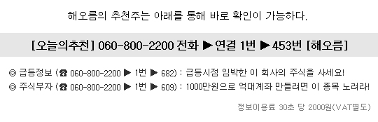 ▶ 관련기사 ◀ ☞또 터진다! 매수만 하면 수백% 날리는 극비세력주! ☞1000만원으로 억대 계좌 만들려면 이 종목을 노려라! ☞이 종목 지금 매수하면, 억대계좌 무조건 터진다!