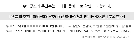 ■ 추천종목은 기사가 게재되는 연관 종목과 다를 수 있으니 추천 종목명을 꼭 확인하시기 바랍니다. ■ 본 자료는 정보제공을 위한 보도 자료입니다. 본 정보는 이데일리의 편집방향과 다를 수 있습니다. 제공되는 정보는 참고자료일 뿐이며, 본 사이트를 통해 제공된 정보에 의해 행해진 거래에 대해서 당사는 법적인 책임을 지지 않습니다.