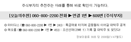 ■ 추천 종목은 기사가 게재되는 연관 종목과 다를 수 있으니 추천 종목명을 꼭 확인하시기 바랍니다. ■ 본 자료는 정보제공을 위한 보도 자료입니다. 본 정보는 이데일리의 편집방향과 다를 수 있습니다. 제공되는 정보는 참고자료일 뿐이며, 본 사이트를 통해 제공된 정보에 의해 행해진 거래에 대해서 당사는 법적인 책임을 지지 않습니다.