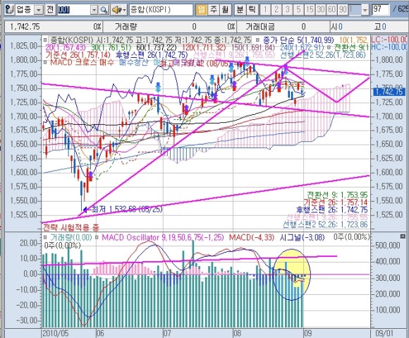 [최원도 전문가의 ‘세력주 공략’] 글로벌증시 전체가 경기회복 지연감에 조정을 받고 있다. 국내증시역시 1800선을 넘기지 못하고 고점이 낮아지는 이등변 삼각형의 조정을 받으면서 방향성을 모색하고 있다. 이부분대의 지수의 갈림길로서 상당이 중요한 위치에 있다고 판단 한다. 1780선을 돌파한다면 좋은 모습이나 반대로 1720이하로 하락한다면 또한 좋지 않는 모습이다. 현재는 박스권(1780~1720) 횡보조정을 받고 있으면서 까탈스런 장세가 전개되고 있어 대응하기가 만만치않다. 투자전략 자체로는 지수가 황보조정중이기 때문에 보수적으로 대응할것을 권장드리며 기간을 두고 분할매입 하는 전략이 최상책이라 판단 드릴수 있으며 1720선은 국내 증시의 중요한 지지라인이 될것이라는 것을 말씀드릴 수 있다. 종합지수 일봉 [매매 전략] money f&s 주력주인 조비(001550)는 31000원부근 분할차익(250%수익) 하고 기간을 두고 조금씩 재매입을 하고 있으며, 전일 신규추천은 바른전자(일부손절) 제너시스템(상한가) 효성오앤비(상한가) 를 추천하여 좋은 수익을 올리고 있다. 제너시스템 효성오앤비 최원도 전문가는 증권 라이브 전문가입니다. [전문가클럽 안내 : 02-3772-0309, 0310] [본 글은 전문가의 투자 의견으로 이데일리의 의견과 다를 수 있습니다. 본 글은 투자에 참고용이며 매매에 대한 책임은 투자자 본인에게 있음을 양지하시기 바랍니다] |
