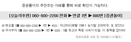 ▶ 관련기사 ◀ ☞9월 내내 재료터지며, 연상한가 직행할 백원대 종목! ☞9월 최고의 폭등 시세가 터질, 이 종목을 잡아라! ☞덕산하이메탈 15배↑ 능가할 초대박주, 또 찾았다!