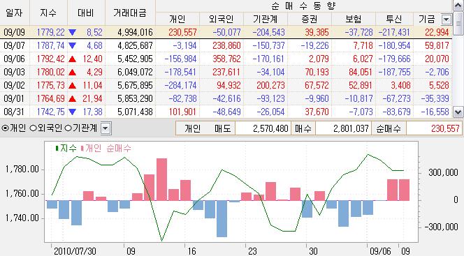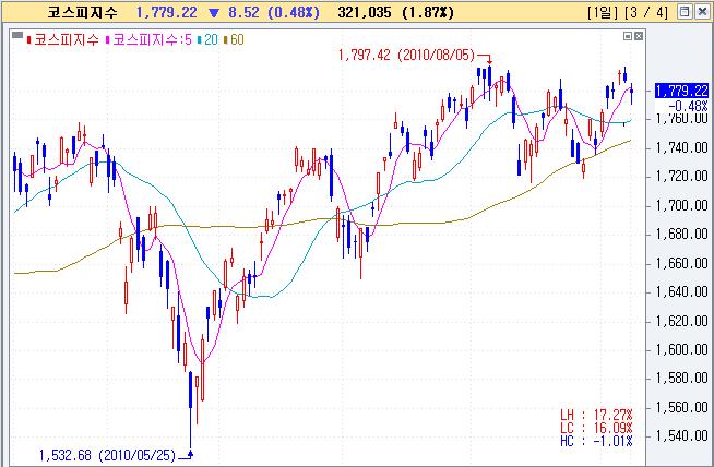 현재 우리시장은 단기조정을 받고 있기는 하지만 전반적인 분위기는 상승기조를 이어가고 있는 흐름입니다. 새로운 지수대를 앞두고 차익실현 욕구와 경계성 매물로 인해 1800을 고지에 두고 몇번이나 좌절하는 모습을 보이기는 했지만 끊임없이 돌파를 위한 시도를 하고 있고, 조만간 돌파에 성공할 것으로 보여집니다.