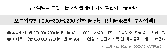 ▶ 관련기사 ◀ ☞4,000%↑날린 세력들! 이 종목에서 터뜨린다. ☞10배 급등 노린다면 이 종목은 무조건 사라! ☞3000% 세력이 만지는 大폭등주, 지금 증시 뒤집는다!