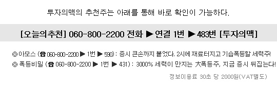 ■ 추천종목은 기사가 게재되는 연관 종목과 다를 수 있으니 추천 종목명을 꼭 확인하시기 바랍니다. ■ 본 자료는 정보제공을 위한 보도 자료입니다. 본 정보는 이데일리의 편집방향과 다를 수 있습니다. 제공되는 정보는 참고자료일 뿐이며, 본 사이트를 통해 제공된 정보에 의해 행해진 거래에 대해서 당사는 법적인 책임을 지지 않습니다.