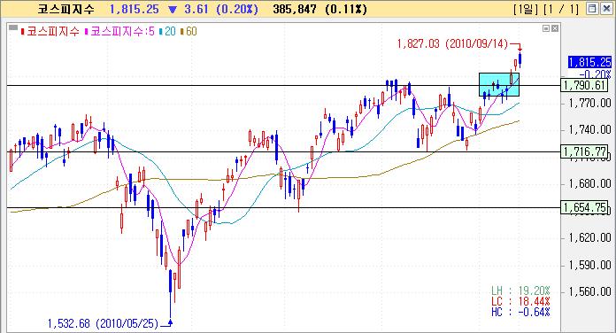 3거래일째 순매수를 보이며 어제에 이어 오늘도 열심히 외국인이 투신의 매도물량을 받아주기는 하였지만 대규모로 쏟아진 기관의 매물과 장 후반 돌아선 개인의 매도물량도 힘을 더해 지수는 3.61p 하락한 1,815.25p를 기록하며 장을 마감하였습니다.