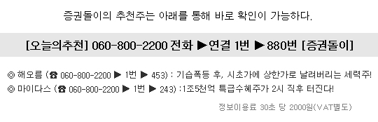 ▶ 관련기사 ◀ ☞증시 큰손 다 붙었다. 딱 한번 매수로 억대계좌 터질 종목! ☞1조5천억 특급수혜주가 2시 직후 터진다! ☞3,000% 날아갈 극비세력주, 오늘 또 터진다!