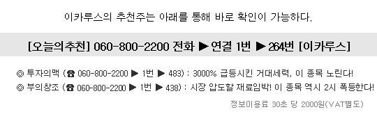 ▶ 관련기사 ◀ ☞종잣돈 10배 만들고 싶다면, 이 종목 노려라! ☞3000% 급등시킨 거대세력, 이 종목 노린다! ☞9월의 스타주, 초고속 성장주가 곧 터진다!