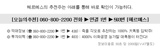 ▶ 관련기사 ◀ ☞극비공개, 삼성전자 30조원의 절대적 천원대 수혜주! ☞비장의 각오로 추천하는 1000% 大폭등 임박주! ☞12배 다날 능가할 초대박주 이번 10월 또 나온다!