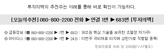 ■ 추천종목은 기사가 게재되는 연관 종목과 다를 수 있으니 추천 종목명을 꼭 확인하시기 바랍니다. ■ 본 자료는 정보제공을 위한 보도 자료입니다. 본 정보는 이데일리의 편집방향과 다를 수 있습니다. 제공되는 정보는 참고자료일 뿐이며, 본 사이트를 통해 제공된 정보에 의해 행해진 거래에 대해서 당사는 법적인 책임을 지지 않습니다.