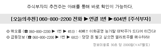 회원들이 뽑은 최고 인기 전문가 ‘주식부자’는 투자 전략을 통해 올해 최고의 대박주로 기록될 종목을 극비리에 공개한다며, 다음 투자 전략을 통해 밝혔다. 뛰어난 재무구조와 함께 상반기 영업이익 증가율이 무려 2000%나 폭증하는등 경이적인 실적을 기록했다. 전방산업의 호황 속에 급격하게 성장하고 있는 중국 시장을 비롯 해외시장에서 선전하면서 폭발적인 턴어라운드가 하반기에도 계속되면서 급등 스타주를 요구 하는 현 주식 시장과 딱 맞아 떨어지는 기가 막힌 종목임에 한 치의 의심도 없다. 세력들이 주가를 급등시키기 전에는 항상 징후가 나타난다. 필자가 추천하는 종목들은 이런 징후가 확인되고 급등 파동이 진행되었는데 이 종목에서도 거래 급증과 함께 매집 시그널들이 계속해서 발생되고 있다. 실적과 재료의 엄청난 파괴력을 감지한 세력의 유통 물량 싹쓸이가 진행되고 있어 이제 날리는대로 날아갈 수 밖에 없는 종목이다. 장담하건데 수일 내에 물량 확보에 실패하면 올해 다시는 이런 엄청난 폭발력을 가진 종목을 찾기 어려울 것이며 동사의 실체가 시장에 드러날 경우 투자자들을 열광 시키며 급등은 필연적이다. 현금이 없다고 고민할 필요도 없다. 지금 당장 물려 있는 종목을 던지고 이 종목으로 갈아 타야 한다. 팔고 나면 오를 것 같아 아쉬움이 있는 종목일지라도 결국은 이 종목의 상승율과는 비교조차 할 수 없기 때문이다 필자의 오랜 경험으로 볼 때 동사와 같이 확실한 급등의 명분을 완벽하게 갖추고 유통 물량을 싹쓸이 할 정도로 세력의 대대적인 매집이 끝난 종목은 추격 매수의 기회도 주지 않고 즉시 수직 상승이 전개된다. 무엇보다도 현시점에서는 대시세가 터지기 전 물량부터 확보하는 것이 최우선 되어야만 한다. 첫째, 시장 점유율1위, 상반기 영업이익 2000%↑, 폭발적 실적 호전! 시장 점유율이 60%로 1위를 기록하고 있으며 국내외 굴지의 기업들을 주요 매출처로 확보 했다. 상반기 영업 이익이 2000% 이상 폭증했고 급속하게 성장 하고 있는 중국 시장에서 선전하고 있다. 또한 전방 산업의 업황이 호전되고 있어 하반기에도 실적 급증세가 이어지면서 확실한 급등의 명분을 뒷받침 하고 있다. 둘째, 세력의 완벽한 물량 장악, 폭등 전 마지막 눌림목! 주가가 급등하려면 세력들이 유통물량을 완전하게 장악하는 것이 필요한데 이미 완전한 손바뀜 속에 유통물량을 싹쓸이 했다. 마지막 눌림목 후 본격적인 수직상승이 전개되면 추격매수도 쉽지 않을것이다. 폭발적인 급등랠리가 초읽기에 진입하고 있어 현재 시점은 급등전 매수할 수 있는 절호의 기회라는점을 강조한다 셋째, 수직 급등 임박, 날리는 대로 날아간다! 이 종목은 기본적으로 100% 정도 급등하기 전까지는 매물에 대한 부담이 없다. 따라서 세력들이 날리는 대로 날아 갈 수 밖에 없는 종목이다. 이글을 보고도 당신이 고민하는 시간이 길어질수록 대박 수익율에서는 멀어진다는 사실을 반드시 알기 바란다. 경험상 이런 종목은 한번 시세가 터지면 어지간한 강심장이 아니고선 추격 매수도 쉽지 않을 급등주로써 이제 세력이 날리는 대로 날아 갈 수 밖에 없다. 마지막으로 강조하지만, 이번 추천주는 엄청난 자금이 움직이는 초특급 세력주로써 조만간 재료가 공개되면 연속 상한가 시세가 터지면서 원금 회복은 기본이고 엄청난 수익을 올릴 수 있다. 원금 손실로 절박한 심정에 있는 투자자들과 종잣돈을 크게 불리고 싶은 분들은 오늘 이 글을 읽는 순간 만사를 제쳐두고 무조건 이 종목을 매수해 두길 바란다. 유료ARS 증권정보는 30초당 2000원(VAT별도)의 이용료가 부과됩니다. [핫이슈 종목 게시판] 3노드디지탈(900010)/오스템(031510)/아토(030530)/혜인(003010)/대원강업(000430)/AP시스템(054620)/흥아해운(003280)/KH바텍(060720)/와이솔(122990)/KTH(036030) ■ 추천종목은 기사가 게재되는 연관 종목과 다를 수 있으니 추천 종목명을 꼭 확인하시기 바랍니다. ■ 본 자료는 정보제공을 위한 보도 자료입니다. 본 정보는 이데일리의 편집방향과 다를 수 있습니다. 제공되는 정보는 참고자료일 뿐이며, 본 사이트를 통해 제공된 정보에 의해 행해진 거래에 대해서 당사는 법적인 책임을 지지 않습니다. ▶ 관련기사 ◀ ☞장중 상한가 터지고, 시초가부터 폭발할 극비大박주! ☞당장 돈 벌고 싶으면 이익 12배 성장의 엘리트주를 매수하라! ☞오늘 아니면 시간이 없다! 10배 날아갈 극비종목! |