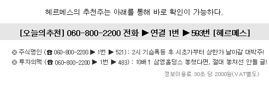 딱 한번 매수로 손실계좌를 한방에 복구하는 것은 물론, 순식간에 억대계좌가 터질 10월장 최고의 급등 임박주를 찾았다. 그렇다고 흥분해서 몰빵하는 일이 있어서는 안된다. 이제부터는 물량을 얼마나 확보하느냐가 관건이기 때문에, 세력이 눈치채지 못하게 철저하게 분할매수로 접근해서 물량을 확보하시기 바란다. 한마디로 먼저 잡는 사람일수록 더 크게 버는 중요한 순간이니 만큼, 망설이다가는 기회를 놓친다는 것을 명심해야 한다. 분명하게 이야기 하지만, 이 종목은 재료가 공개되는 순간 모든 투자자들이 열광할 수 밖에 없기 때문에 어설프게 터져도 수 백% 기본이고, 시장에 풀린 핫머니의 무차별적인 유입까지 감안하면 상한가를 밥 먹듯 말아 올리며, 조선선재의 26연상을 뛰어 넘을 하반기 최대의 돌풍주임에 틀림없다. 따라서 필자를 믿고 청취하시면 대박의 기쁨을 만끽할 것이다. 첫째, 이 종목 놓치면 올해 내내 분해서 잠 못잔다! 필자에게 200%↑ 추천주는 일상적인 수준이라 할 수도 없다. 필자의 추천주로 엄청나게 수익 나서, 지금은 웬만한 빌딩 짓고 월세 받아가며 재미 삼아 투자하는 분이 몇 있다. 이 종목도 ‘이제 왔구나’ 하는 무혈입성의 매수구간에 돌입하고 있어 다급하게 추천 드리니만큼, 바로 매수해 억대계좌 한방에 터지시길 바란다. 이렇게 알려주었는데도 이 종목을 놓친다면 장담하건대 올해 내내 분해서 잠을 이루지 못할 것이다. 둘째, 거대세력의 종가관리가 시작되었다. 조만간 터진다! 동사는 거대 큰손들이 단기간에 10배↑ 이상의 폭등시세를 노리고 타깃으로 점 찍은 초대박주로, 이미 세력들이 물량을 완벽하게 장악했기 때문에 상한가를 치고 가는데 불과 3분이면 충분하다. 특히 2시만 되면 느닷없이 폭등세를 보였는데, 이런 모습이 포착되면 3~4일 안에는 대부분 대폭등이 시작된다. 따라서 있는 종목 다 던져도 좋다. 이 종목은 평생 한번 잡을 수 있을까 말까 한 폭등주 이니만큼, 절대 놓치지 말기를 바란다. 셋째, 조선선재 29배↑ 기록 깰 초대박주, 드디어 터진다! 전 재산을 털어서라도 꼭 사고 싶을 정도로 탐이 나는 초대형 종목으로, 초장기 상승파동을 위해 장기 대바닥을 치고 모든 이평선들을 정배열 시켰다. 지금은 대대적으로 시세를 날리기 위해 마지막 남은 매물 대를 벗기며 급등의 초읽기에 돌입한 상황인데, 최근 며칠간은 매물 공백에 따른 자연스러운 가격조정까지 보이며, 다시는 보지 못할 저렴한 매수기회까지 주고 있다. 필자는 증권전문가의 이름을 걸고, 이번 주부터 단기간에 폭등의 가속을 붙일 수 있는 종목은 전 종목을 통틀어 이 종목이 유일하다는 것을 확신한다. 상반기 조선선재 29배↑ 급등은 이야기 거리도 안 되는 폭등시세가 바로 터질 것이다. 유료ARS 증권정보는 30초당 2000원(VAT별도)의 이용료가 부과됩니다. [핫이슈 종목 게시판] 우리들제약(004720)/STX메탈(071970)/동양강철(001780)/남선알미늄(008350)/동국S&C(100130)/평화정공(043370)/혜인(003010)/대우증권(006800)/한양이엔지(045100)/후성(093370) ■ 추천종목은 기사가 게재되는 연관 종목과 다를 수 있으니 추천 종목명을 꼭 확인하시기 바랍니다. ■ 본 자료는 정보제공을 위한 보도 자료입니다. 본 정보는 이데일리의 편집방향과 다를 수 있습니다. 제공되는 정보는 참고자료일 뿐이며, 본 사이트를 통해 제공된 정보에 의해 행해진 거래에 대해서 당사는 법적인 책임을 지지 않습니다. ▶ 관련기사 ◀ ☞당장 돈 벌고 싶으면 이익 12배 성장의 엘리트주를 매수하라! ☞10배↑ 삼영홀딩스 놓쳤다면, 절대 놓쳐선 안될 글! ☞투자금 1억을 만들 수 있는 단 한번의 기회에 집중하라! |