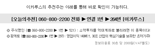 필자와 함께 하는 회원들은 큰 투자금의 필요성을 절대 느끼지 못한다. 이 순간에도 장중 급등으로 치고 올라갈까 초조함에 연일 차트만 바라보게 되는데, 아무래도 개장초부터 급속도로 물량이 속속 사라지는 걸 보면, 장 마감 전 혹은 내일부터라도 시초가부터 날릴 태세다. 따라서 이 종목은 이르면 오늘 오후장 내지는 적어도 2~3일내로 폭풍질주가 예상되기에 지금 서두르지 않는다면 단 한주도 잡지 못할 수 있다. 특히, 이 종목은 불과 한 달도 체 안되 500% 오른 비티씨정보와 판박이라 하겠다. 비티씨정보를 보면, 9월 초 점상한가로 치고 오르던 주가를 의도적으로 폭락시키며 다시 물량 주워담아 총 상한가 11방 째 기록 중이다. 이 종목도 마찬가지다. 주포들이 작정하고 두 달 전 며칠 간 상한가로 말아 올린 직후 급하게 물량 털고 한달 간 물량 다시 주워담은 흔적이 곳곳에 포착되고 있다. 과거에도 이 종목은 단 3~4분만에 상한가 말아올린 후 곧바로 수직급등해 불과 천원대에서 석달 만에 2600%까지 대폭등을 한 전력이 있다. 그런데, 이번엔 더 큰 시중의 핫머니와 거대세력까지 몰린 것으로 파악되는 급등 초입기라, 시세 터지기 전 선매집이 다급히 요구되는 종목이라 하겠다. 지면상으로 밝히기에는 한계가 있지만, 대한민국 최고의 애널리스트로 최고의 길을 걷고 있다고 자부하는 필자가 이번에야말로 모든 명예와 양심을 걸고 진정 대폭등 종목이란 어떤 것인지 확실히 보여줄 때가 온 것이다. 또 하나의 긴급추천주를 보너스로 전격공개 하고자 하는데, 총 두 종목 중 시기의 차이일 뿐 두 종목 모두 급등시세가 기대되 여러분이 오늘 필자의 기사를 보게 된 것은 감히 천운을 만난 것이라 장담한다! 각설하고 결론부터 말하면, 이 보너스 종목은 피인수설로 300% 올라줬던 다사로봇과 우리들제약처럼 시중에실제 이런 재료들이 이슈화되기 전에 급하게 매수가 필요한 종목이다. 특히 이 보너스 종목은 지난 6월 제 4이동통신 테마로 단 두달만에 10배 오른 삼영홀딩스의 급등 전 패턴과 아주 유사하다. 현재 숨겨진 재료가치와 세력 매집규모 만으로도 원금대비 몇 배 이상 주가급등이 기대되고 있는데, 여기에 본격적인 성장기로 진입한 스마트그리드 산업에 따른 연말장 최대 수혜주라는 사실이 알려지는 순간, 시장의 매수세가 급속도로 유입되며 순식간에 상한가로 문 닫는 것은 물론이며, 시세의 꼭지점을 함부로 예단할 수 없는 핵폭풍과 같은 종목이라 판단된다. 그리고 동사는 이미 한국전력으로부터 스마트그리드와 관련된 대규모 수주가 체결된 상황이고, 내년 2011년 1월경에 미국 최고 가전전시회(CES)에서 이슈가 바로 스마트그리드 기술을 적용한 제품이 될 것이기 때문에, 여기에 관련된 수혜주는 한 두달 전인 이번 11월과 12월에 반드시 주가폭등이 먼저 나오게 될 가능성이 농후함을 절대 잊으면 안된다. 마지막으로 필자는 이 두 종목만큼은 무슨 일이 있더라도 챙겨가시길 다시 한번 당부드리는데, 연초까지 가져가신다면 정말 대박이 날 수 있는 종목임을 다시 한번 강조한다. 유료ARS 증권정보는 30초당 2000원(VAT별도)의 이용료가 부과됩니다. [핫이슈 종목 게시판] 시노펙스(025320)/두산인프라코어(042670)/비티씨정보(032680)/엔케이바이오(019260)/대호에이엘(069460)/신성ENG(104110)/신화인터텍(056700)/누리플랜(069140)/인터파크(035080)/차이나킹(900120) ■ 추천종목은 기사가 게재되는 연관 종목과 다를 수 있으니 추천 종목명을 꼭 확인하시기 바랍니다. ■ 본 기사는 개시 후 24시간 이내에 참고하시길 권장합니다. ■ 본 자료는 정보제공을 위한 보도 자료입니다. 본 정보는 이데일리의 편집방향과 다를 수 있습니다. 제공되는 정보는 참고자료일 뿐이며, 본 사이트를 통해 제공된 정보에 의해 행해진 거래에 대해서 당사는 법적인 책임을 지지 않습니다. ▶ 관련기사 ◀ ☞세계 최초의 기술로 11월을 주도할 100원대 종목! ☞영업이익 140배↑, 30조 산업의 핵심기술을 보유한 초저가주! ☞세계최초의 기술로 11월장 폭등의 가속을 밟을 급등임박주! |