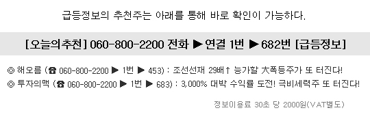 ▶ 관련기사 ◀ ☞이 종목 지금 매수하면, 27배↑ 인터플렉스 기록 갈아치운다! ☞3,000% 대박 수익률 도전! 극비세력주 또 터진다! ☞세계1위 등극, 단숨에 세계시장 평정할 극비세력주!