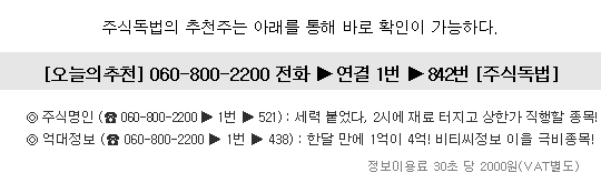 ▶ 관련기사 ◀ ☞300%↑ 크레듀 뒤이을 극비세력주 또 찾았다! ☞1억이 한달 만에 30억, 조선선재 후속주 또 터진다! ☞적정가 1만원까지 수직폭발 할 1천원대 세계최고 IT기술!