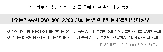 지면상으로 밝히기에는 한계가 있지만, 20년 넘는 동안 애널리스트로 최고의 길을 걸어왔던 필자의 모든 명예와 양심을 걸고 진정 대폭등 종목이란 어떤 것인지 확실히 보여줄 기막힌 종목임을 자신한다.
