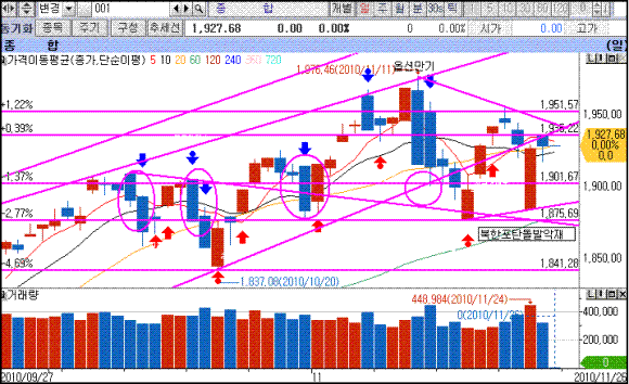 [정홍주 실장의 ‘마켓 집중공략’] 북한의 돌발 악재는 항상 위기속에 기회로 찾아 왔으며 이번에도 역시 위기속 기회로 찾아왔다! 북한발 악재가 있는 날 외국인은 알고서도 종가에 선물 및 현물 대량매도의 흐름은 없었으며 이후 대량 매도의 흐름은 나오지 않고 있는 상태였기에 역시 단발성에 그칠 가능성을 내비추고 있는 모습이다. 우하향 쌍봉과 우상향 쓰리저점이 형성되며 상승전환 시도가 이어지고 있으며 아직 5일선을 회복 못하였지만 곧 회복 할 것으로 기대되며 12월달 소비시즌을 맞이하여 기업들의 실적도 상당히 좋아 질 것으로 기대하고 있다. 최근 변동폭이 큰 상태로 한 쪽 방향성을 정하는 날 상당히 관성의 법칙이 나올 가능성이 높다. 상승시 흔들고 가면 상승폭이 큰 경우가 많았으며 만약 못간다면 상당한 기간조정에 들어간다. 다음주 방향성이 나올 것으로 기대하며 미국의 소비지표가 살아나고 있는 상태이기에 그에 따른 주가 상승세에 촛점을 맞추고 있는 상태이다. 또 한 개인들의 북한돌발 악재에 투매를 던지며 현,선물 대량매도의 의미를 부여한다면 역시 주식은 상승쪽으로 볼 수 밖에 없다. 월봉상 장기 상승폭은 2400P까지는 보고 있는 입장이기에 대세상승세를 즐겨야 한다.! [투자 전략] 10일선을 손절가로 정하며 지속 순매수전략으로 접근한다. 북한의 추가 도발의 가능성은 낮다고 판단되지만 만약 터진다 하여도 그것이 무서워 매수전략을 구사 안할 수도 없는 위치이기에 북한도발의 미지수는 배제한 상태로 말하자면 2000P를 향한 흐름속에 지속 매수관점으로 접근해야 한다. [선물,옵션누적포지션] 외국인 하락 개인 상승 선물,옵션동향보다 추세매매를 이어나가는 것이 중요/ 다만 포지션이 하락이기에 추격매수만 자제하자. [업종과 종목] 최근 외국인,기관의 집중 매수 업종을 보자면 단연 IT, 금융의 은행쪽이다. 이러한 수급의 움직임을 보면서 대응하시게되면 주도업종을 골라 낼 수 있으며 주도업종을 공략해야 빠른 수익이 가능 하다. 또한 연속성이 있는 상승이 나오지만 개별주를 매매한다면 단기성에 그칠 가능성이 높다. IT의 삼성전자(005930),하이닉스(000660) 중심의 매매는 지속되어야 하며 상당히 저평가되어 있는 기업은행(024110) 및 KB금융(105560)의 지속 공략 대상으로 삼고 있는 상태이다. 자동차 관련주 , 화학주 그동안 상승세를 꾸준히 이어왔지만 최근 탄력이 둔화되는 모습이 나오고 있기에 재차 추세를 회복하기 전까진 새롭게 부각되고 있는 주도업종으로 공략하는것이 안전하며 빠른 수익이 나올 것으로 기대하고 있다. 업종내에서도 종목장세가 나오고 있는 것처럼 동국제강(001230)은 철강주중 나홀로 강세를 보이고 있다. 그만큼 지금 시장은 종목을 잘 고르지 못한다면 수익이 나지 않는 장세로 지수상승세에 소외될 가능성이 높기에 종목을 잘 골라야 할 것이다. 정홍주 실장(강남큰손)은 이데일리TV 방송 “실전매매 고수에게 듣는다” 및 “신고수열전” 출연자이며, 시황방송 전문가입니다. [전문가클럽 안내 : 02-3772-0309, 0310] [본 글은 전문가의 투자 의견으로 이데일리의 의견과 다를 수 있습니다. 본 글은 투자에 참고용이며 매매에 대한 책임은 투자자 본인에게 있음을 양지하시기 바랍니다] ▶ 관련기사 ◀ ☞[공개방송]오늘은 개별주 공략, 장마감 직전까지 승부한다! ☞[공개방송]오늘은 개별주 공략, 장마감 직전까지 승부한다! ☞화려한 종목 장세에서 소외되지 않으려면? |