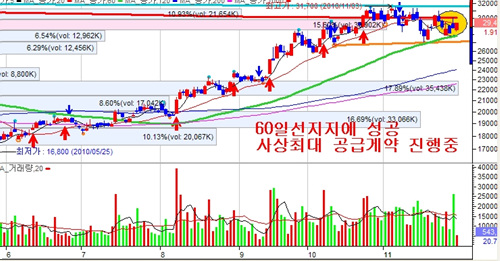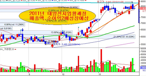 [장규철 전문가의 "텐배거 만들기"] 북한발 리스크로 증시가 좀처럼 한치 앞이 안보이는 상황입니다. 그 동안 지정학적 리스크에 의한 주가 조정은 대부분 단기간에 극복되었다는 점을 주목하시기 바랍니다. 또한 현재 북한의 추가 도발 우려로 시장 심리가 극도로 위축되고 있습니다. 북한의 과거 도발 행태를 볼 때, 연속적으로 도발한 사례는 거의 없었다는 점과 중국의 중재 노력등을 감안한다면 시장의 전환점이 멀지 않았다고 봅니다. 외국인의 이탈징후는 최근 위기 상황에도 없었다는 점에서 차분하게 시장을 바라 볼 필요가 있습니다. 종합지수는 소폭 밀리긴 하지만 60일선 위에서 강하게 버텨주고 있습니다. 뉴스에 민감하게 반응하기보다는 좀 더 멀리 내다보고 현재 오르거나 내리지 않고 잘 버티는 종목들을 포트폴리오로 새로 짜 보시기 바랍니다. 시장이 안정되면 더 큰 수익을 줄 것으로 기대됩니다. 아래 종목들은 최근 관심을 갖고 있는 대표주들입니다. 오늘처럼 힘든 상황에서도 셀트리온(068270)은 외국인의 수급의 힘으로 역사적 고점을 또 넘어갑니다. 시장이 어려워도 가는 종목은 갑니다. 사상최대 대규모 공급계약을 진행하고 있는 대우조선해양(042660) 바닥 잡는 모습입니다. 덴마크 머스크사와의 40억달러에 달하는 공급계약 우선협상자로 단독 선정되면서 뛰어난 기술 경쟁력을 인정 받았다는 점에서 향후 실적 호전 기대됩니다. 2011년 태양전지 업황은 쾌청입니다. 향후 10년간 중국에서는 850조원,미국에서는 180조원,한국정부에서는 40조원을 태양광에 쏟아 붓는다고 알려졌는데 신성홀딩스(011930)도 내년에 매출액,순이익 모두 2배이상 성장할 것으로 예상됩니다. 시장이 조정 받아도 이런 종목으로 사신다면 좋은 결과 있을 것이라 봅니다. 장규철 전문가(백룡승천)은 시황방송 전문가입니다. [전문가클럽 안내 : 02-3772-0309, 0310] [본 글은 전문가의 투자 의견으로 이데일리의 의견과 다를 수 있습니다. 본 글은 투자에 참고용이며 매매에 대한 책임은 투자자 본인에게 있음을 양지하시기 바랍니다] |