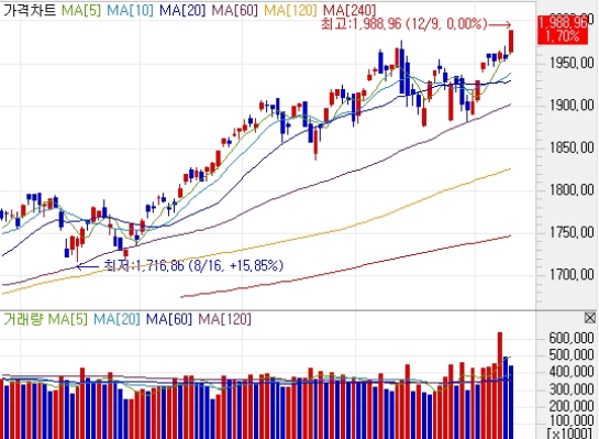 [김성세 실장의”The Prestige club”] * 업종별 전체 업종별 상승세 우세. 전기전자, 은행, 운수장비, 유통업, 비금속광물 등 상승마감 건설업, 섬유의복 등 하락마감 * 종목별 시가총액 상위 상승세 우세. 삼성전자, 현대차, 현대모비스, 현대중공업, 신한지주, KB금융 등 상승 마감. 삼성엔지니어링, 현대건설, 아모레퍼시픽, 대한생명, GS건설 등 하락 마감. 위의 차트에서 보는 바와 같이 지수는 최근 추세상승을 이어가며 신고가를 갱신하는 모습을 보여주었다. 결국 지수는 전일 대비 33.24포인트(1.7%) 상승한 1988.96으로 마감했다. 옵션만기일을 맞이하여 금통위의 금리결정이라는 호재가 작용하며 지수는 3년만에 최고치를 경신하는 모습을 나타냈다. 업종별로 보면 전체 업종별 상승세 우세한 가운데 전기전자, 은행, 운수장비, 유통업, 비금속광물 등 상승 마감했고 건설업, 섬유의복 등 하락마감하였다. 종목별로 보면 시가총액 상위 상승세 우세한 가운데 삼성전자, 현대차, 현대모비스, 현대중공업, 신한지주, KB금융 등 상승 마감했고 반면 삼성엔지니어링, 현대건설, 아모레퍼시픽, 대한생명, GS건설 등 하락 마감했다. [투자의견] 코스피 지수는 3년만에 최고치를 경신하며 필자의 예측대로 2000선 돌파를 눈앞에 앞둔 상황을 만들고 있다. 옵션만기의 충격이 아닌 오히려 프로그램매수세가 강하게 유입되면 시작부터 강했던 지수는 추세상승을 강화하며 마감하였는데 특히 금통위에서 예상대로 금리동결 결정이 긍정적으로 작용한 것도 지수 상승을 더욱 촉발시켰다. 필자의 예측대로 12월 안에 코스피지수는 2000선 돌파는 무난할 것으로 예상되고 있고 이후 내년 초까지 추세적인 흐름을 더욱 강화될 것으로 기대하고 있다. 다만 단기적인 상승에 따른 기술적 조정에 대한 흐름도 무시하면 안될 것이다. 단기 상승이 꾸준히 이어진 만큼 중간 중간 나올 수 있는 작은 조정흐름에 적절한 대비를 해둘 필요가 있겠다. 그 동안 북한 악재 등 여러 악재를 거듭한 결과물이라는 점에서 더욱 의미 있으며 현재의추세를 보아 추가 상승은 당연하다는 판단이다. 또한 미국은 블랙프라이데이 이후 소비지표가 꾸준히 긍정적이고 중국 시장도 긴축 악재에 대한 내용이 잠잠해진 상태여서 호재에 더욱 민감하게 반응하는 시장 분위기가 연출 될 것이다. 주요 이슈로 부각되었던 종목은 연말랠리 기대감으로 증권주들이 연일 강세흐름이 이어지고 있는 가운데 특히 삼성증권은 7일 연속 상승세를 이어가며 신고가를 기록했다. 한편 슈퍼박테리아 국내환자 발생소식으로 큐로컴, 케이피엠테크, 크리스탈, 큐로홀딩스 등 관련주가 일제히 급등마감하였다. 주식에서 가장 기본적인 주식 상승의 원리는 바로 주식의 기술적 차트 흐름이다. 아래 차트는 최근 급등주의 기본패턴을 잘 보여주고 있는 크래듀의 차트이다. 필자는 이러한 급등흐름이 나올 차트를 발견하였고 이에 투자자들의 빠른 참여를 권해드린다. 이렇듯 주식에서 기본적인 주식의 원리와 흐름을 잘 이해하게 되면 정말 돈 벌기 쉬운 일이 아닐까 생각한다. 왜 주식에서 매번 실패를 보는가? 근본적인 것부터 차근 차근 생각하기 바란다. 투자참여자는 이런 기본적인 진리를 충실히 지켜주기만 해도 수익은 나게 되어 있다. 최근 장에서 수익을 올리지 못하는 투자자가 있다면 지금이라도 필자의 조언을 따르기 바란다. 참고로 최근 제우스가 추천한 큐로컴(040350), 케이피엠테크(042040), 온미디어, 성융광전투자, 크레듀, 한국정보공학, 유비프리시젼, 티에이치엔, 동양시스템즈, 성융광전투자, 한화케미칼, 인지디스플레, 모헨즈, 두산건설, 넥센타이어, 유니온, 휴맥스, 한진중공업홀딩스, 혜인, 두산건설, 현대상선, 현대엘리베이터, STX, SK에너지, 두산인프라코어, 대우인터내셔널, NHN, 이구산업 등으로 단기 고수익을 내고 있다. 이제 새로운 종목에 베팅을 시기임을 명심하라. 이제 새롭게 준비된 종목이 있으니 어려우면 필자의 조언을 따르기 바란다.오늘도 성공투자 하시길. 김성세 실장(제우스)는 이데일리TV “신고수열전” 출연자이며, 시황방송 전문가입니다. [전문가클럽 안내 : 02-3772-0309, 0310] [본 글은 전문가의 투자 의견으로 이데일리의 의견과 다를 수 있습니다. 본 글은 투자에 참고용이며 매매에 대한 책임은 투자자 본인에게 있음을 양지하시기 바랍니다] |