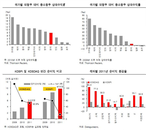 [이광희 소장 '미래를 여는 투자'] 코스피가 연중 최고치를 경신하며 역대 고점을 향해 나아가고 있습니다. 단기 급등에 대한 부담으로 속도는 더뎌진 모습이지만 상승 흐름은 여전히 유효합니다. 조만간 코스피 사상 최고가인 2007년 10월 31일 기록한 2064.85 포인트도 무리없이 넘어갈 것이라는 기대가 나고고 있습니다. 금일 코스피는 전일대비 1.02포인트(0.05%) 오른 2038.11을 기록했습니다. 장중에는 2040선도 뚫고2045.39까지 올랐었고, 전일 세웠던 연중 최고치를 장중, 종가 기준으로 모두 경신했습니다. 미국발 훈풍과 유럽증시 상승 소식에 힘입어 강세로 출발한 코스피는 개장 초 연중 최고점까지 올랐지만 기관 매물이 늘면서 소폭 하락과 오름을 반복하며 혼조세를 보였고, 외국인과 개인이 주식을 대거 담았지만 2040선 안착에는 실패하였습니다. 전일 소폭 매도세로 돌아섰던 외국인은 3532억원 순매수했고, 개인도 1915억원 사들였습니다. 기관은 4637억원 매도했습니다. 펀드 환매 압박이 커지면서 기관 중 투신권에서만 3000억원 가까이 매물이 나왔습니다. 하지만 시장의 유동성은 아직도 풍부한 모습입니다. 이달 들어 외국인은 3일을 제외하고 국내증시에서 사자로 일관했습니다. 16일동안 사들인 금액은 3조1785억원에 달하는 반면 매도 우위를 보였던 3거래일동안 매도는 고작 480억원에 불과했습니다. 이같은 외국인들의 사자행진은 좀더 이어질 것으로 보입니다. 아시아 증시에서도 외국인의 순환매 흐름이 나타나는데 인도, 인도네시아, 필리핀, 태국 등 자금 유입이 둔화되는 반면 일본, 한국, 대만 등은 최근에도 순매수가 지속되고 있습니다. 이는 한국증시의 올해 상승률은 아시아 9개국 중 중간 수준이고 밸류에이션은 낮기 때문이며,따라서 국가별 순환매 측면에서 외국인의 우리 증시에 대한 관심은 앞으로도 계속될 것으로 보입니다. [투자전략] 외국인의 연속적인 매수세와 더불어 개인들의 시장 참여도 높아지는 가운데 우리증시는 거침없는 상승을 이어가고 있습니다. 아직도 시장의 시그널은 상승을 유지하고 있으며 기대심리도, 유동성도 좋은 모습입니다. 악재보다 호재에 반응하며 순풍에 돛을 단듯 견조하게 움직이고 있습니다. 하지만 늘 말씀 드리지만 시장의 상승에 기대를 갖되 단기적인 조정을 염두해 두어야 할 것입니다. 내년 1분기 실적 전망은 긍정적으로 예측되고 있지만 금년 4분기 실적전망이 상당 수준 하향될것이라는 관측도 나오고 있습니다. 따라서 기업들의 실적 발표 시점에서 어닝쇼크를 경험할수도 있는 만큼 기업 실적내용을 유의깊게 체크하여 투자에 임하는 자세가 필요합니다. 이전 투자전략에서도 말씀 드렸지만 지금 시장은 순환매 양상이 뚜렷하게 나타나고 있습니다. ITㆍ자동차ㆍ석유화학의 ‘삼두체제(triumvirate)’에 금융, 조선, 정유, 철강 등이 끼어들면서 순환매 양상이 벌어지고 있습니다. 화학과 운송장비는 정유와 조선의 상승 탄력이 살아나며 기존 석유화학과 자동차의 에너지 약화를 상쇄하고는 있지만, 업종의 전체적인 영향력은 약화되고 종목별 차별화는 뚜렷해졌습니다. 철강주는 철강 가격 인상과 선진국의 경기 회복 모멘텀과 저가 매력이 동시에 작용하며 가장 강력한 에너지를 분출하고 있습니다. <주간 업종별 등락율> 하지만 이처럼 순환매 장세가 이어지는 것은 연말을 앞두고 시장을 주도하는 외국인들의 적극적인 수익 추구 움직임으로 판단됩니다. 따라서 개인으로서 빠른 속도의 기관 주도 순환매를 따라가기보다는 이익가시성이 높은 편안한 업종을 선점하는 편이 좋을것으로 보입니다. 공급 부족 해소에 시간이 걸리는 정유ㆍ석유화학과 수주 바닥 탈피 수혜가 큰 조선업종 내 저평가주를 관심있게 지켜볼 필요가 있을것으로 보입니다. 또한 그동안 시장에서 소외되어 있던 코스닥 시장으로의 관심도 필요해 보입니다. 금일은 코스닥 시장의 전망에 대해 좀더 세밀히 분석해 보겠습니다. 코스닥 시장은 당기순이익 기준으로 58%(KOSPI 58.4%) 전년대비 실적 성장세에도 불구하고 주가 흐름은 여전히 미진합니다. 이는 실적전망에 대한 신뢰도의 문제로, 2011년 역시 50.9%로 KOSPI 13.3% 대비 월등한 상승세가 예상되는 만큼 2011년은 실적전망 신뢰도 회복을 바탕으로 본격적인 주가 상승의 시발점이 될수 있을것이라는 판단입니다. 글로벌 주요국들과 비교해 보더라도 중소형주의 주가상승률은 그간 매우 미진했던 것으로 보입니다. 올 한해만 놓고 보더라도 MSCI 기준 한국 중소형주의 대형주 대비 상대수익률은 7.8%p로 브라질(18.4%p), 태국(13.5%p), 중국(11.7%p) 등 주요 이머징 국가 및 선진국 대비해서도 낮은 수익률을 나타냈습니다. 이익전망의 신뢰도가 담보된 내년 상반기는 특히 중소형주의 실적성장성에 대한 밸류에이션 프리미엄이 본격적으로 반영되는 투자의 적기가 될 것으로 판단합니다. 따라서 실적을 동반하면서 중장기 성장성을 보유한 종목군들로 관심종목을 편입하고 주가의 향방을 주시해야 합니다. 이제 곧 엄청난 상승 랠릴를 이어갈 종목들이 많이 포착되고 있습니다. 문제는 타이밍 입니다. 행복 클럽은 이러한 분석을 바탕으로 연말