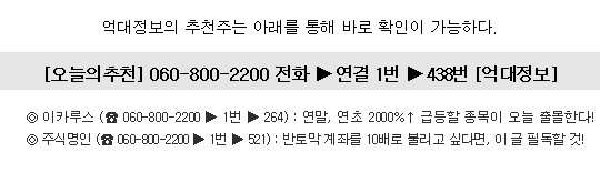 ▶ 관련기사 ◀ ☞절대 비밀유지! 이 종목 조용히 매수해 보세요 ☞반토막 계좌를 10배로 불리고 싶다면, 이 글 필독할 것! ☞억대자산 만들려면 꼭 이 글을 읽어봐야 한다.