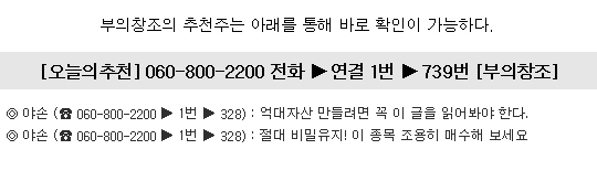 머뭇거리다간 유통물량이 어느 정도 남아줄지 의문인 상황으로 급등세가 펼쳐지면 중간에 편입할 일은 꿈도 꾸지 말아야 할 만큼 시세 터지기 전에 반드시 매수하라! 어느 정도 물량을 담느냐에 따라 당신의 부의 크기가 달라질 수 있다. 이 종목을 잡는 방법만이 주식투자로 유일하게 팔자고칠 수 있다는 점 명심해야 할 것이다.