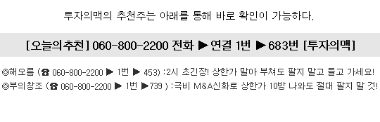 ■ 추천종목은 기사가 게재되는 연관 종목과 다를 수 있으니 추천 종목명을 꼭 확인하시기 바랍니다. ■ 본 기사는 개시 후 24시간 이내에 참고하시길 권장합니다. ■ 본 자료는 정보제공을 위한 보도 자료입니다. 본 정보는 이데일리의 편집방향과 다를 수 있습니다. 제공되는 정보는 참고자료일 뿐이며, 본 사이트를 통해 제공된 정보에 의해 행해진 거래에 대해서 당사는 법적인 책임을 지지 않습니다.
